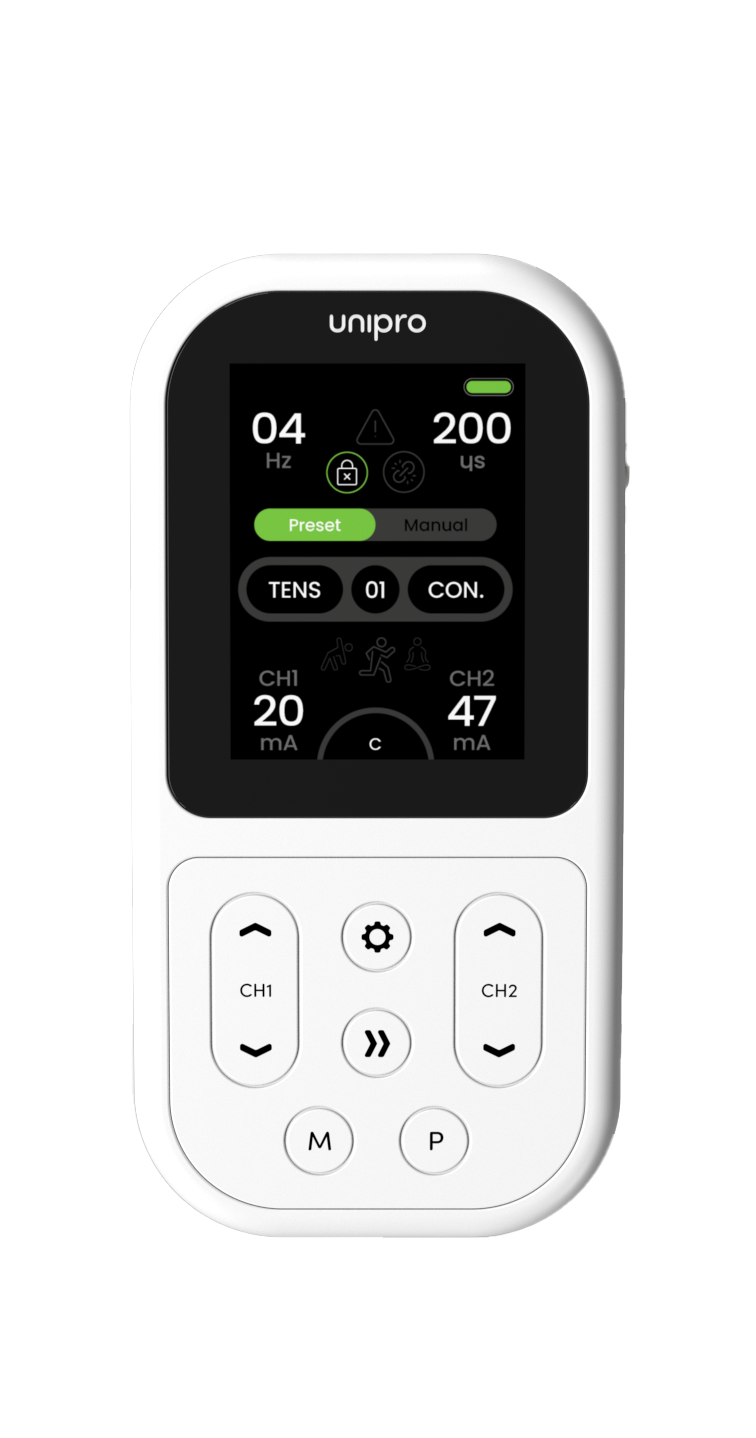 Unipro van TensCare: Een geavanceerde elektrotherapie-oplossing voor fysiotherapeuten, ideaal voor pijnverlichting, spiertraining en revalidatie. Een must-have in elke moderne fysiotherapiepraktijk.
